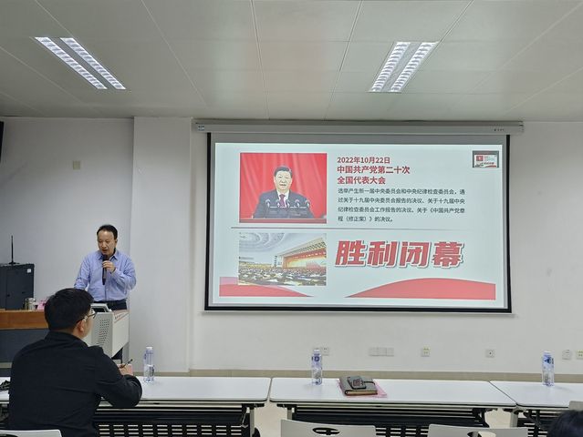 开班式后,学院党委书记赖文忠教授以《党的二十大报告解读》为培训班学员讲授开班第一课。赖文忠教授从党的二十大简况及主要成果、二十大报告提出的新观念、新论断、新思想、新战略以及争做新时代好青年等三个方面深度解读了党的二十大精神。课堂上,赖文忠教授指出:“希望青年学子谨记一代人有一代人的使命、担当、责任和奋斗作为,不断加强对习近平新时代中国特色社会主义思想的学习与领悟、持续推进学习贯彻党的二十大精神,在学深悟透中坚定“两个确立”,增强“四个自信”,勇担中华民族伟大复兴的历史使命。