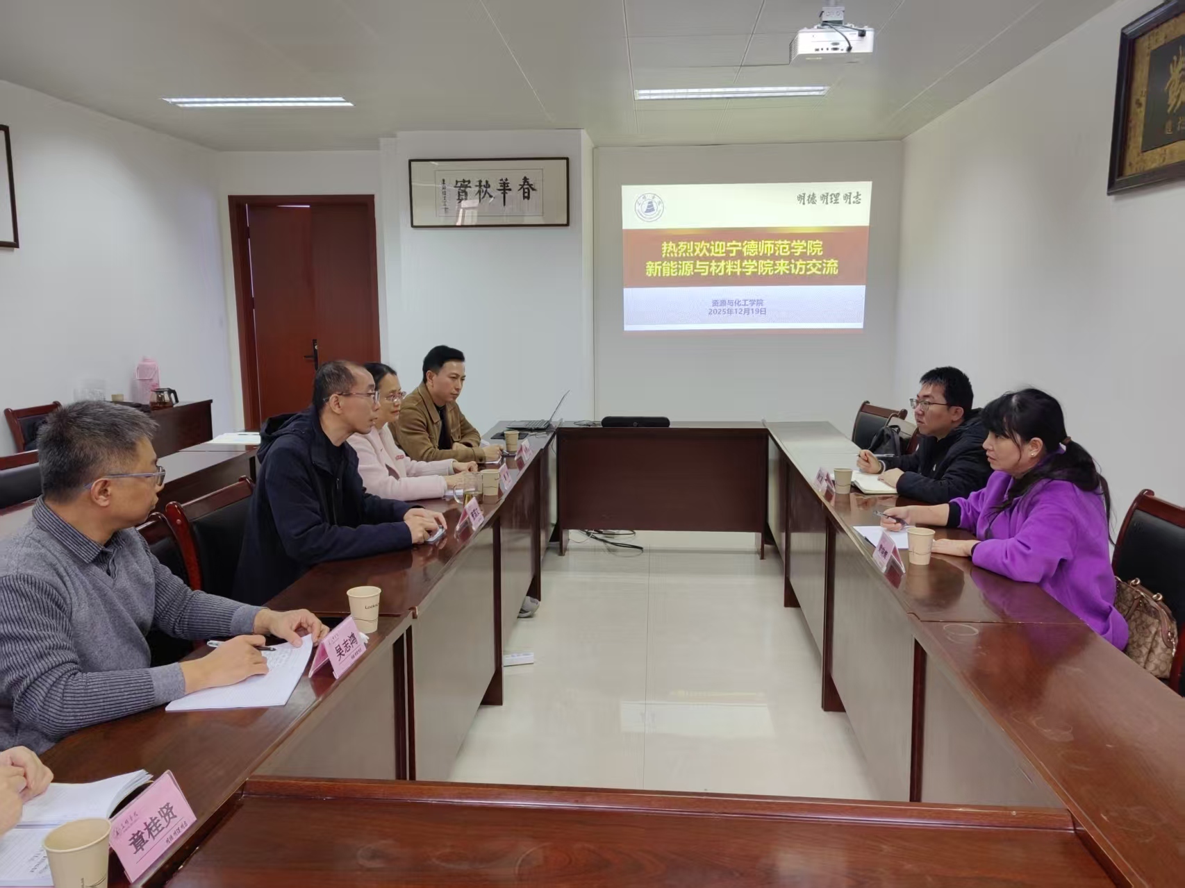 12月19日下午,宁德师范学院新能源与材料学院院长黄晓辉教授、副院长黄仁昆一行到访资源与化工学院,双方围绕研究生培养、学科专业建设、实验室管理等工作开展交流座谈。资源与化工学院党委书记曾玲、副院长董国文及相关教师参与接待。