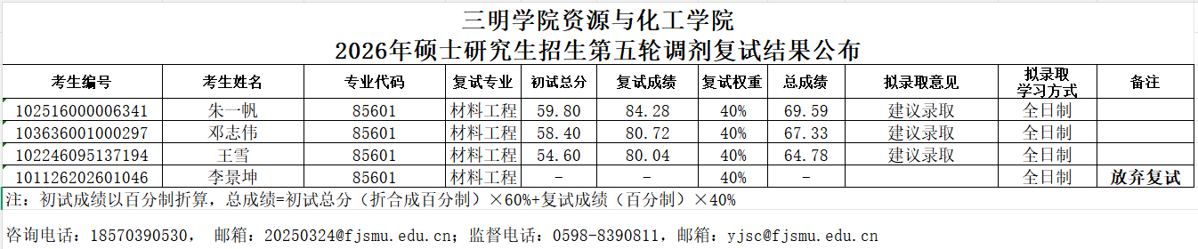 三明学院资源与化工学院 2026年硕士研究生招生第五轮调剂复试结果公布