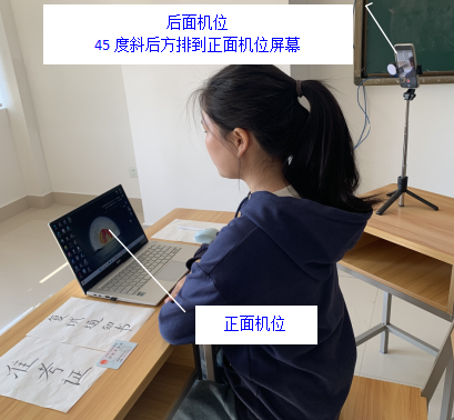 考生端两台设备都需开启摄像头,一台设备将摄像头对准考生本人,另一台设备摄像头从考生后方呈45°拍摄(后方拍摄的设备须关闭音频,防止回音影响复试),并保证考生端考试屏幕能清晰地被复试专家组看到。