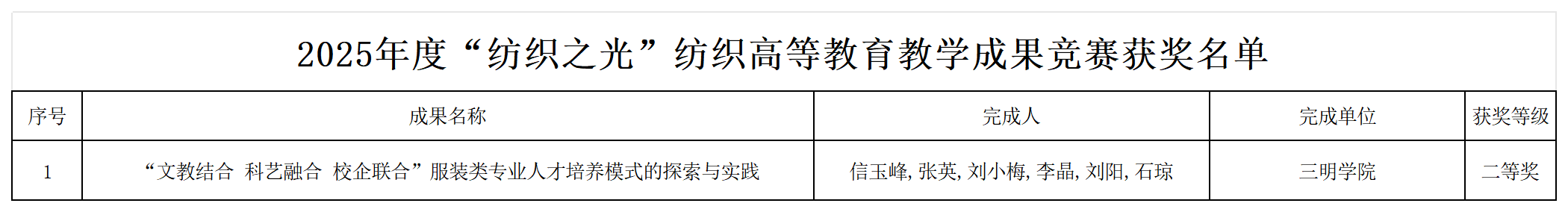 近日,中国纺织服装教育学会公布了2025年度“纺织之光”纺织高等教育教学成果竞赛结果。三明学院艺术与设计学院信玉峰教授团队的《“文教结合·科艺融合·校企联合”服装类专业人才培养模式的探索与实践》项目荣获二等奖。