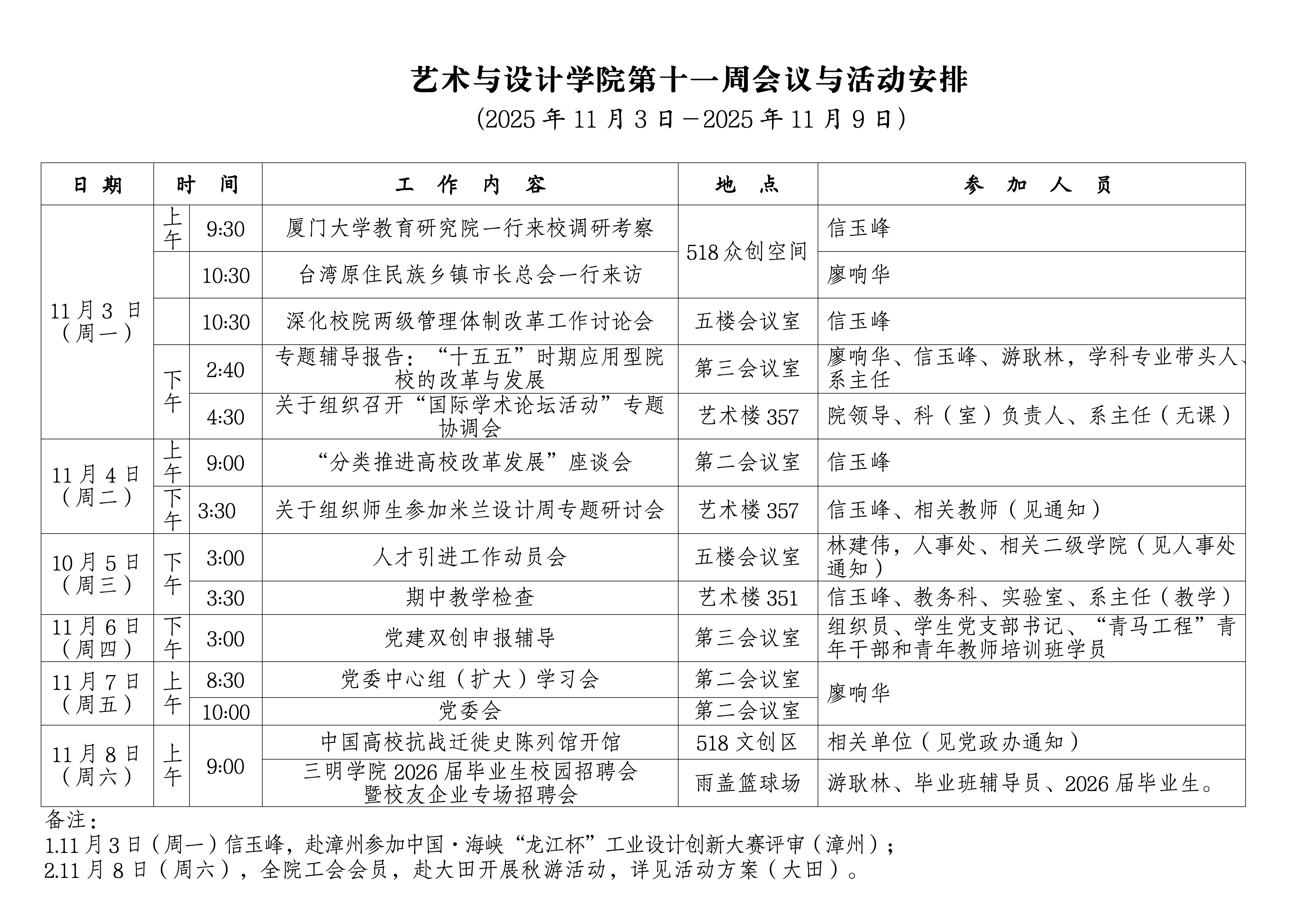 第十一周会议与活动安排(2025年11月3日-2025年11月9日)