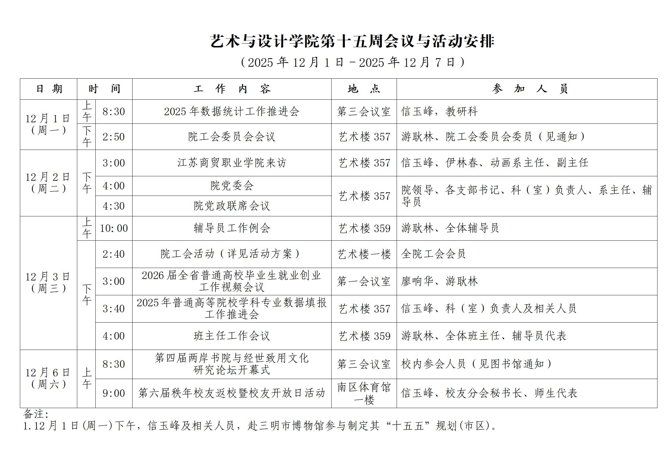 第十五周会议与活动安排(2025年12月1日-2025年12月7日)