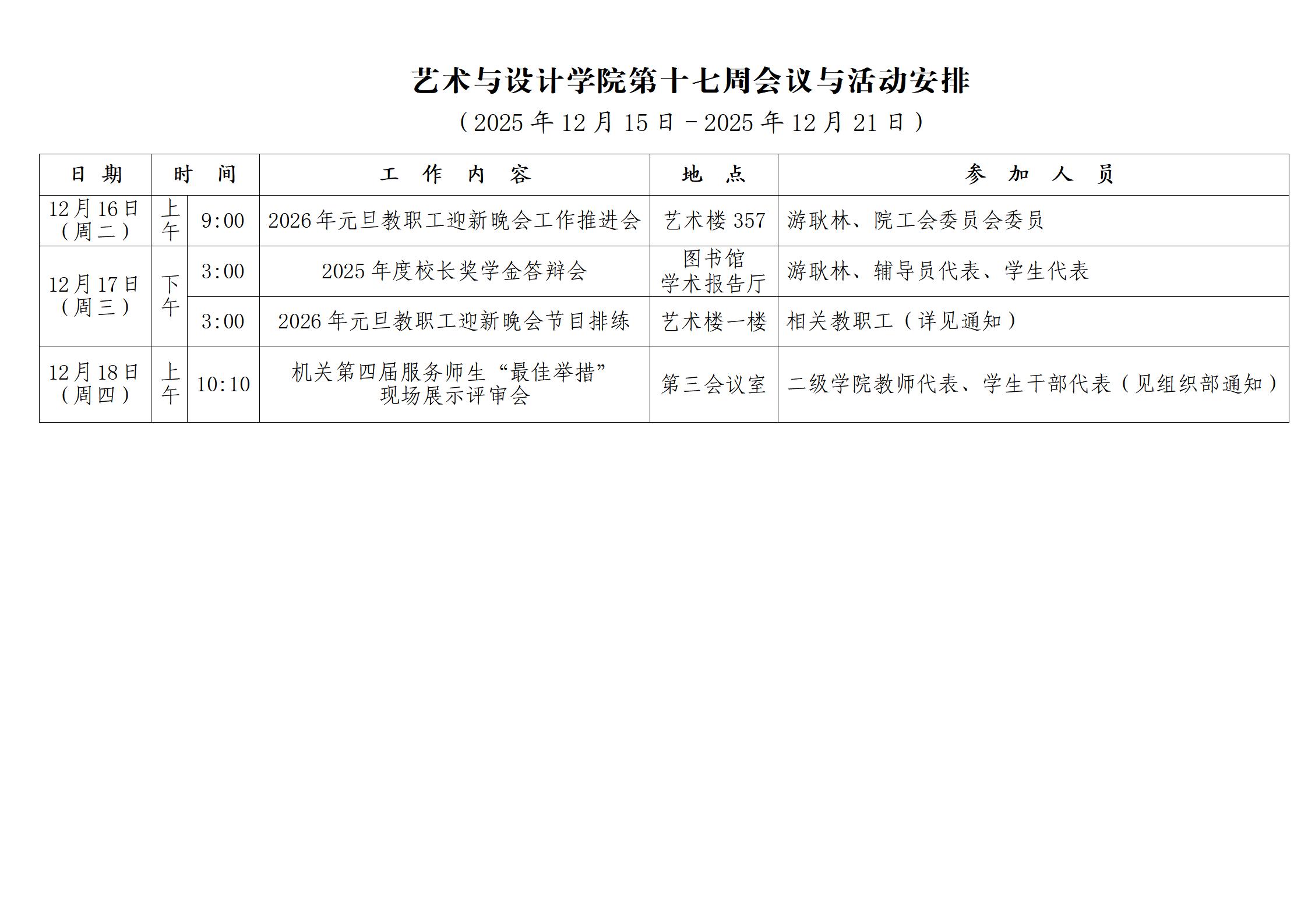 第十七周会议与活动安排(2025年12月15日-2025年12月21日)
