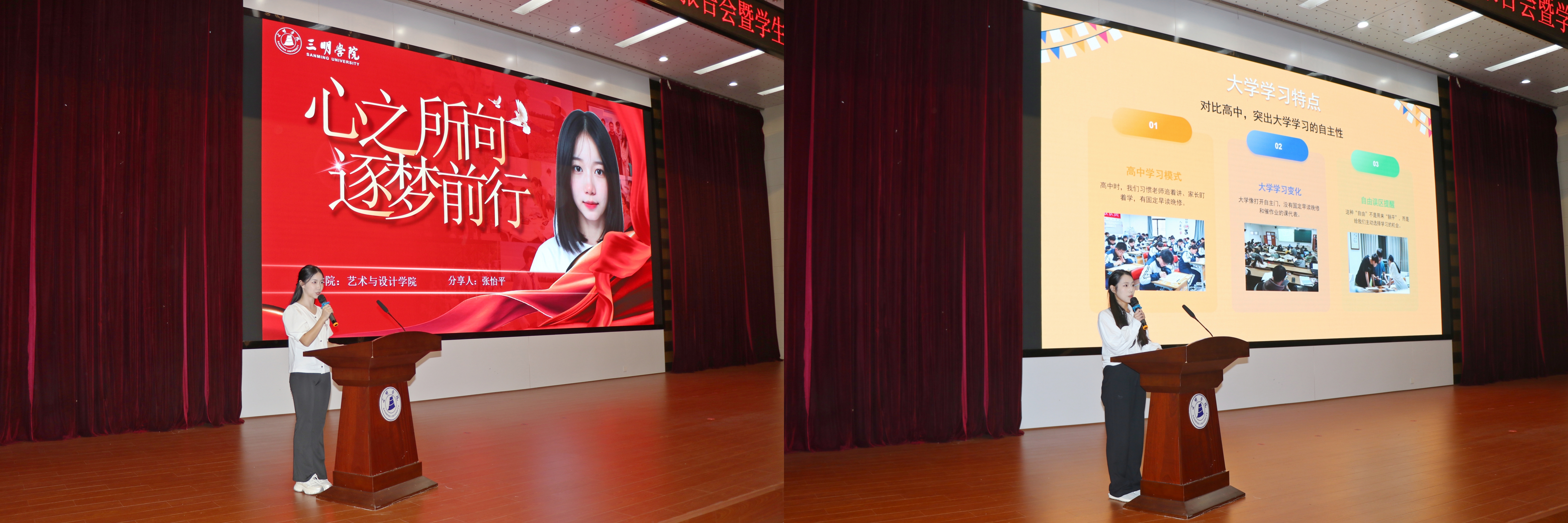 随后,2023级美术学专业张怡平与2024级美术学专业魏旖琪两位国家奖学金获得者,分别分享了各自的学习经验与成长感悟。张怡平从系统学习与时间管理的角度,详细介绍了如何平衡专业课程与竞赛实践;魏旖琪则围绕大学适应与自我探索,鼓励新生主动尝试、勇于突破。两位同学的真诚分享为现场同学提供了切实可行的建议,也展现了学院优良的学风传承。