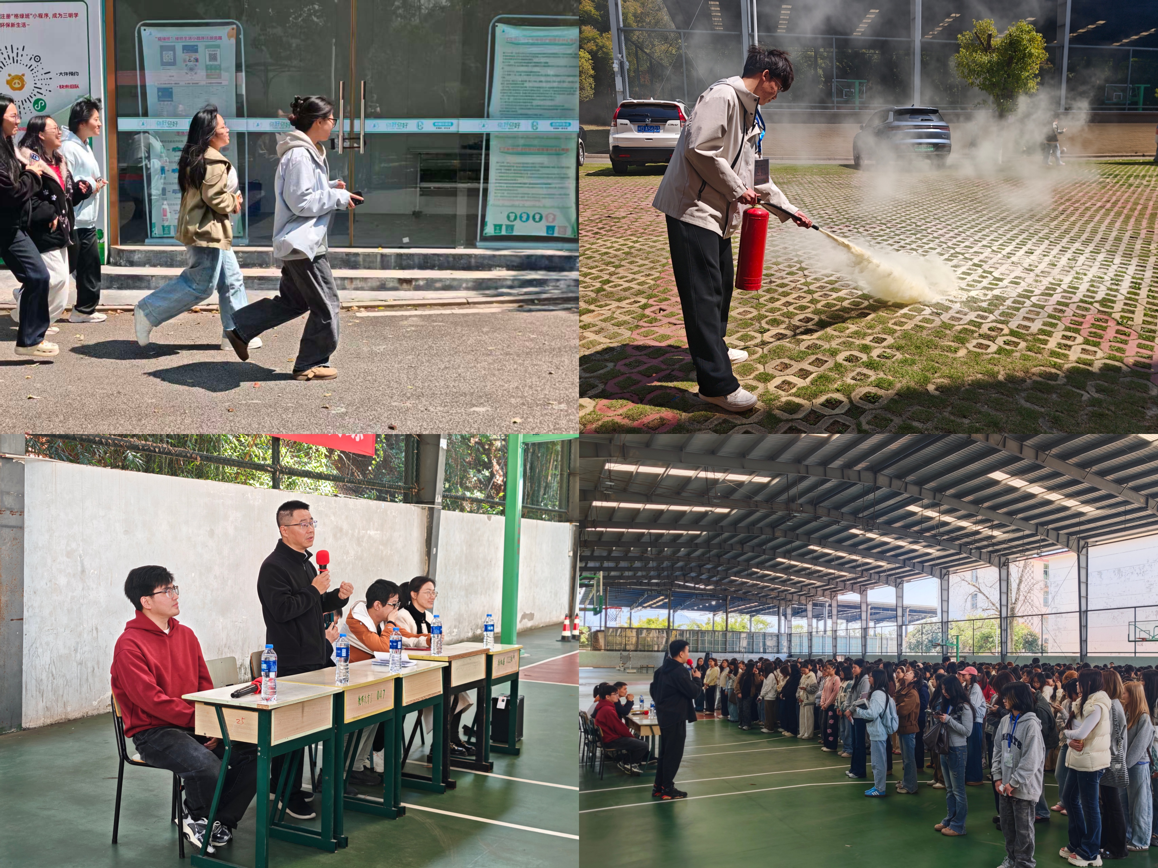 演练期间,同学们在明德楼教室及宿舍同步观看消防安全视频,系统学习消防基础知识,进一步强化安全防范意识。警报响起后,大家立即按照指定疏散路线,弯腰护头、有序撤离,全程严守演练纪律。抵达北区雨盖篮球场集合点后,各班迅速清点人数并逐级上报,确保无人员遗漏。