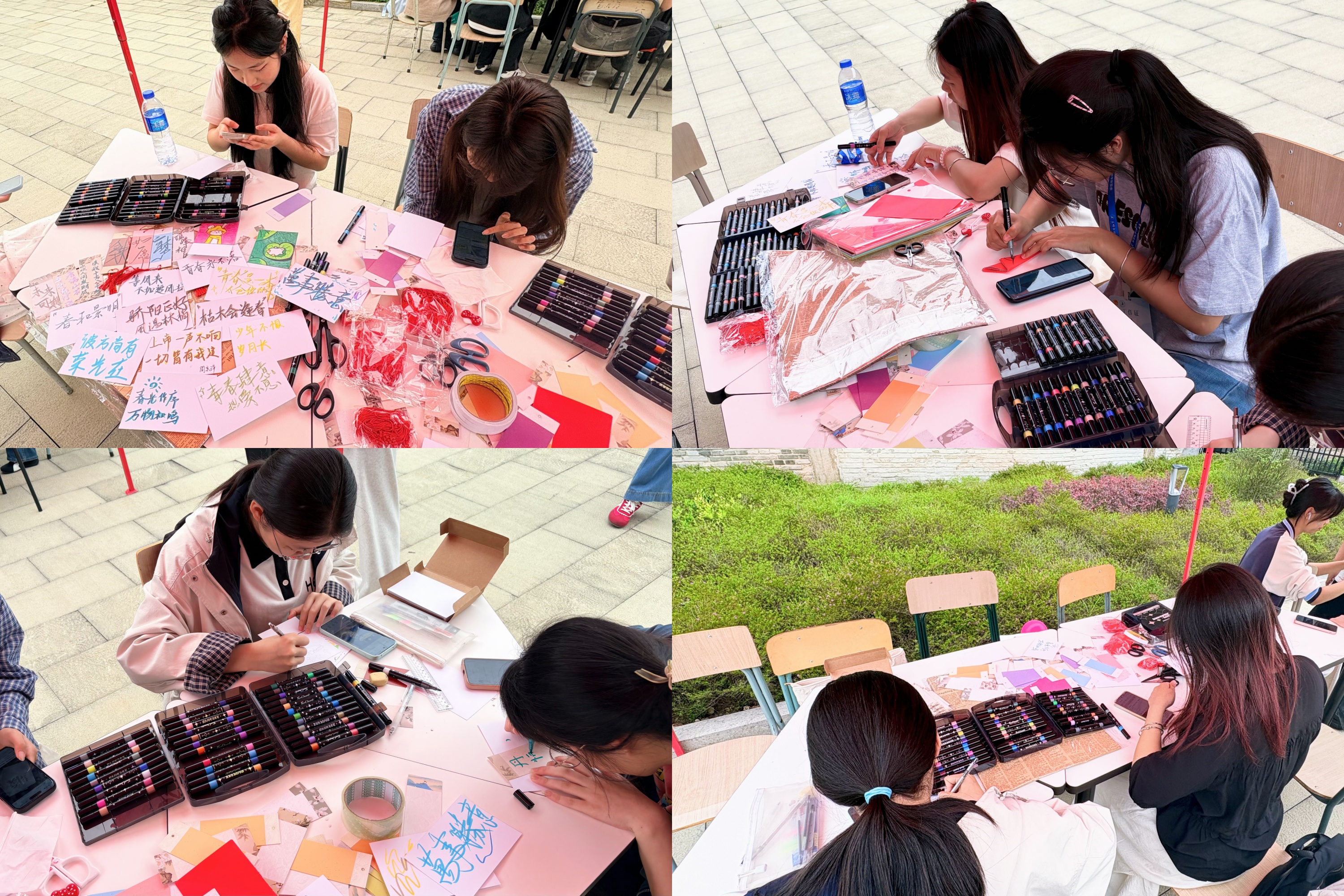 活动现场,艺术设计协会指导同学们用废旧画报、卡纸等材料,以拼贴方式创作校园生活、暖心瞬间等主题作品。绘画与篆刻协会带领大家以“青春校园、同心共进”为主题,勾勒线稿、贴制金箔,制作箔画作品。同学们互相交流创作思路,分享制作技巧,现场气氛活跃,不少同学合作完成作品后互相展示留念。