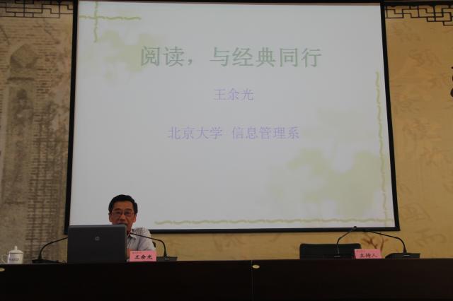 在题为《阅读,与经典同行》的主题报告中,北京大学王余光教授围绕“何为经典”、“为何阅读传统经典”两个话题,提出了“经典”应该包含影响力、时间性、广泛性三个要素,揭示了当今阅读文化的特征和经典阅读的重要现实意义。王余光教授谈到了阅读的现状,和大家一起思考“我们有多少时间来阅读”;在数字阅读崛起的时代,阅读转型的过程中,王余光教授以身边发生的事例来和大家一起探讨数字阅读和纸本阅读的选择,谈笑间,引起在场听众的阵阵笑声与掌声,更令大家深入思考我们的阅读选择。讲座中,王余光教授还推荐了《唐诗三百首》、《古文观止》、《史记》、《论语》、《诗经》等传统经典著作。