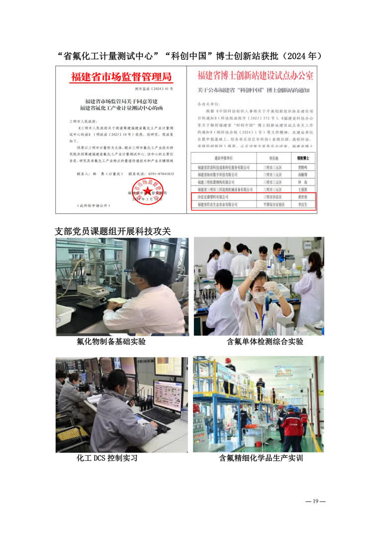 支部科研团队以市场应用为导向,与海斯福东莹化工地方龙头企业联合开发新技术、产品攻克“环境友好型含氟多氧杂表面活性剂”关键技术研发氟钛酸钾、氟硼酸钾等高端无机氟产品推动废盐酸与白泥的综合利用,促成三元区5万吨电子级氢氟酸等项目落地,助推多个项目入驻清流循环经济示范园区。支部在全省率先牵头成立地方氟化工行业协会,连续3年承办中国科学院技术成果对接会,转化科研成果20累计带动企业新增产值20多亿元以支部党员为骨干的福建省氟新材料工程研究中心,两次考评获评优秀等次,获500万元经费资助,相关科研成果获福建科技进步二等奖1项、三等奖3项、省发明专利奖二等奖1项中国产学研合作创新与促进奖1项。