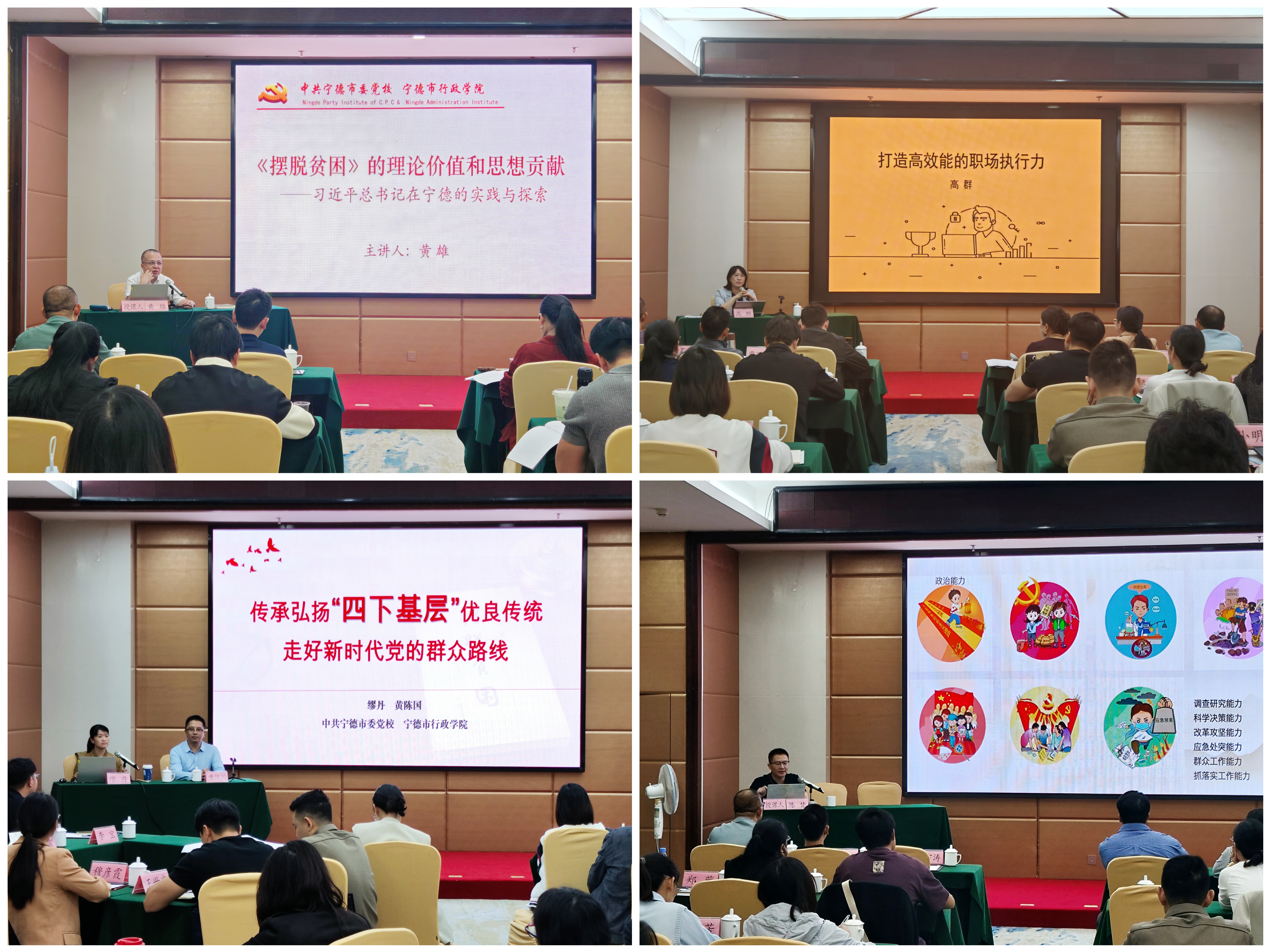 《习近平总书记在宁德的实践与探索——谈<摆脱贫困>的理论价值和思想贡献》专题课堂上,专家以详实的史料和鲜活的案例,系统解读了习近平总书记在宁德工作期间提出的“弱鸟先飞”“滴水穿石”等重要理念的形成脉络与时代价值,让学员们深刻领会到这些宝贵精神财富中蕴含的战略思维和为民情怀;《打造高效能的职场执行力》、《新时代干部必备的七种能力》等课程,则紧密结合高等教育领域的新形势、新任务,通过案例剖析、情景模拟等方式,精准对接干部履职需求,着力提升学员破解难题、推动工作的实战能力;《传承弘扬“四下基层”优良传统》案例教学中,授课教师通过深入解析典型案例,深刻阐释了“宣传党的路线、方针、政策下基层,调查研究下基层,信访接待下基层,现场办公下基层”这一优良传统在新时代的生命力与实践价值。系列课程层层深入,为学员夯实理论根基、注入奋进动力。